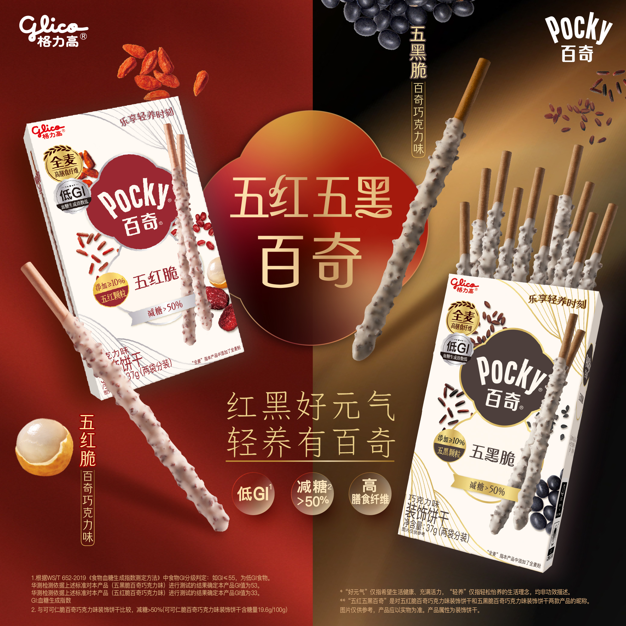 五红五黑百奇是格力高旗下品牌百奇最新推出的健康零食系列,产品立足于中国传统“五红”与“五黑”食材理念,以低GI、高膳食纤维、减糖>50%为核心,为关注健康的消费者及追求活力与品质的“年轻态银发族”打造。
